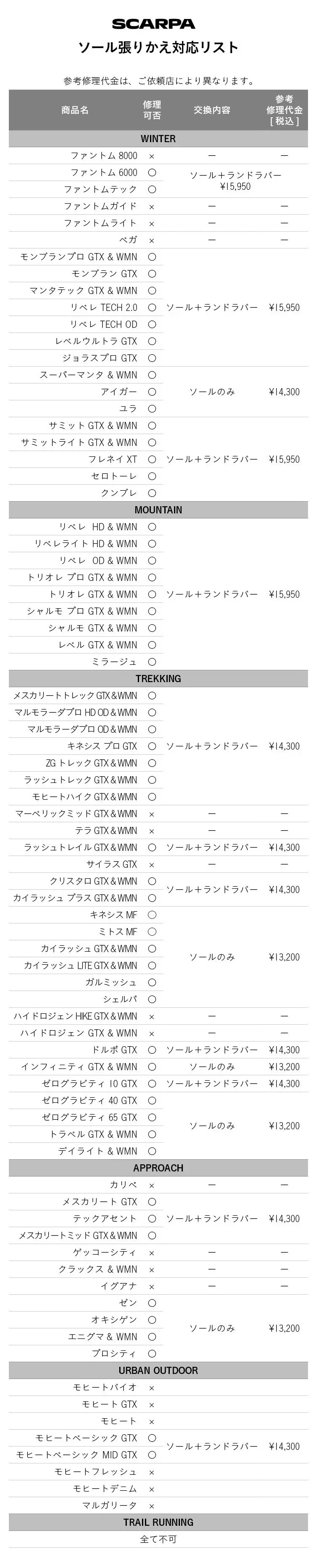 ソール交換の可否、参考修理金額については以下のリストをご覧ください。