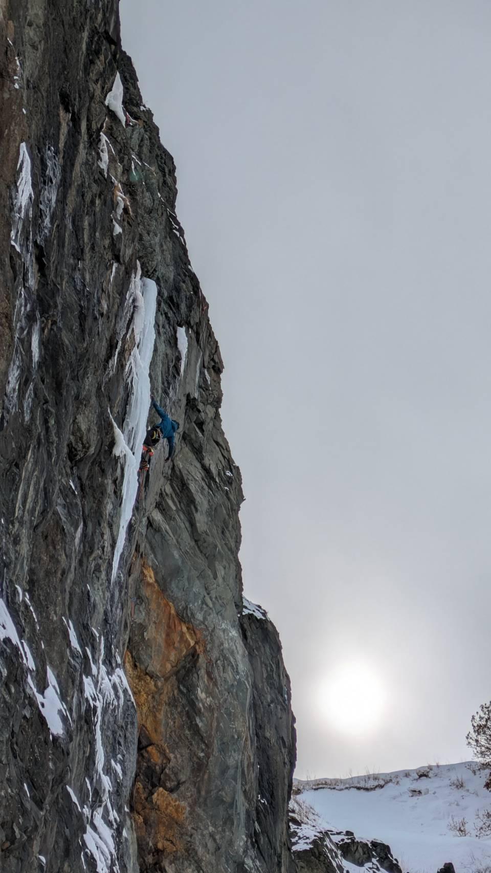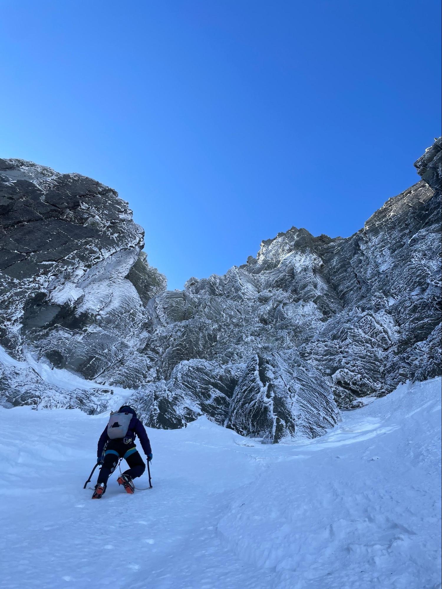 鈴木:錫杖の北東壁右ルンゼで登ったときも、垂直で長いパートがあったけど、ちょっと水が流れているところでもグリップが滑りづらかった。今のところ「グリップが凍りついて持てない」みたいなストレスは感じてない。