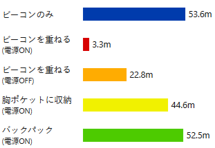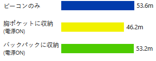 トランシーバーを胸ポケットに収納した場合は、雪崩ビーコンまでの距離を30cm程度しか離すことができず、受信距離が86%まで短くなっています。一方、バックパックに収納した場合、受信距離への影響はほとんどなくなります。